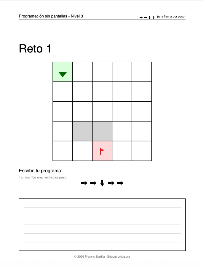 Un cuaderno PDF imprimible para que niños y niñas (6–10 años) desarrollen pensamiento computacional con programación desenchufada (unplugged): planificar pasos, dar instrucciones, corregir errores y resolver laberintos de forma progresiva y divertida, sin pantallas.
